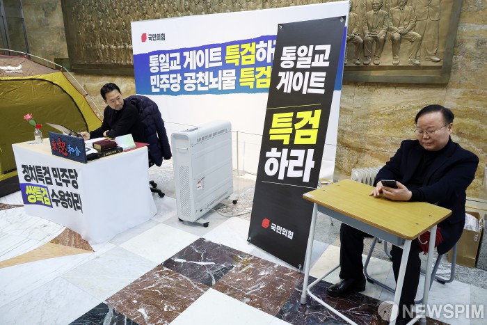 [서울=뉴스핌] 정일구 기자 = 장동혁 국민의힘 대표가 19일 오전 서울 여의도 국회 로텐더홀에서 더불어민주당의 통일교·공천뇌물 '쌍특검' 수용을 촉구하며 닷새째 단식 농성을 이어가고 있다. 오른쪽은 동조 단식에 돌입한 김재원 최고위원. 2026.01.19 mironj19@newspim.com
