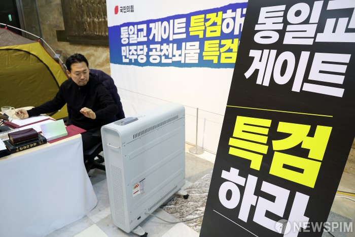 [서울=뉴스핌] 정일구 기자 = 장동혁 국민의힘 대표가 19일 오전 서울 여의도 국회 로텐더홀에서 더불어민주당의 통일교·공천뇌물 '쌍특검' 수용을 촉구하며 닷새째 단식 농성을 이어가고 있다. 2026.01.19 mironj19@newspim.com