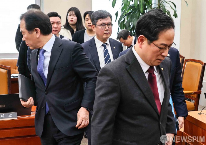 [서울=뉴스핌] 윤창빈 기자 = 정태호 국회 재경위 더불어민주당 간사, 박수영 국민의힘 간사를 비롯한 의원들이 19일 서울 여의도 국회에서 열린 재정경제기획위원회 전체회의에서 이혜훈 기획예산처 장관 후보자 인사청문회 개최와 관련해 논의하기 위해 나서고 있다. 2026.01.19 pangbin@newspim.com