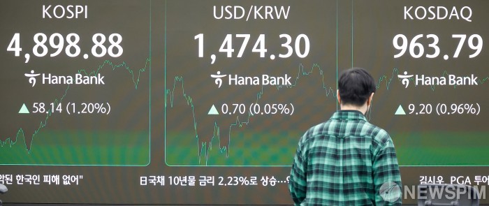 [서울=뉴스핌] 류기찬 기자 = 코스피가 장중 4890선을 돌파한 19일 오후 서울 중구 하나은행 딜링룸 전광판에 코스피, 달러/원, 코스닥 지수가 표시되고 있다. 2026.01.19 ryuchan0925@newspim.com