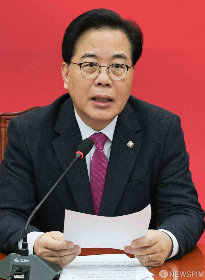 [서울=뉴스핌] 윤창빈 기자 = 송언석 국민의힘 원내대표가 20일 서울 여의도 국회에서 열린 원내대책회의에서 모두발언을 하고 있다. 2026.01.20 pangbin@newspim.com