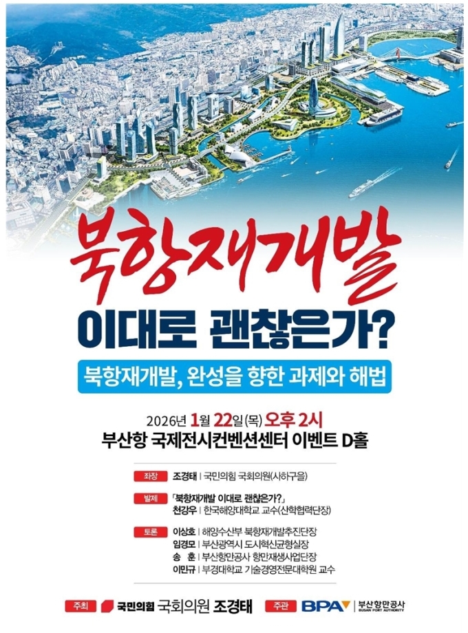 [부산=뉴스핌] 남동현 기자 = 국민의힘 조경태 국회의원(부산 사하을)은 오는 22일 부산항 국제전시컨벤션센터 이벤트 D홀에서 '부산 북항 재개발 정상화 및 입법 개선 정책토론회'를 개최한다고 20일 밝혔다.