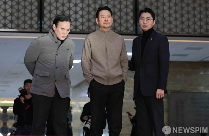 [서울=뉴스핌] 윤창빈 기자 = 통일교·공천헌금 '쌍특검'을 요구하며 엿새째 단식을 진행 중인 장동혁 국민의힘 대표가 20일 서울 여의도 국회 로텐더홀 농성장에서 잠시 나와 박준태 비서실장, 김종양 의원과 대화하고 있다. 2026.01.20 pangbin@newspim.com