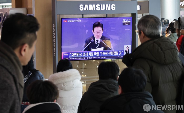 [서울=뉴스핌] 양윤모 기자 = 21일 오전 서울 용산구 동자동 서울역을 찾은 시민들이 '함께 이루는 대전환, 모두 누리는 대도약'의 슬로건으로 개최된 이재명 대통령의 '2026년 신년 기자회견'을 시청하고 있다. 이번 신년 기자회견은 용산 대통령실에서 청와대로 온 뒤 열리는 첫 공식 기자회견으로 청와대 영빈관에서 내외신 기자 160여명이 참석한 가운데 90분간 진행됐다. 2026.01.21 yym58@newspim.com