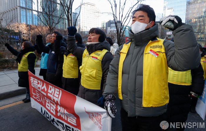[서울=뉴스핌] 류기찬 기자 = 민주노총 서비스연맹이 21일 오전 서울 종로구 MBK 파트너스 사무실 앞에서 ‘MBK규탄 마트노조 홈플러스지부 간부 결의대회’를 열고 구호를 외치고 있다. 2026.01.21 ryuchan0925@newspim.com