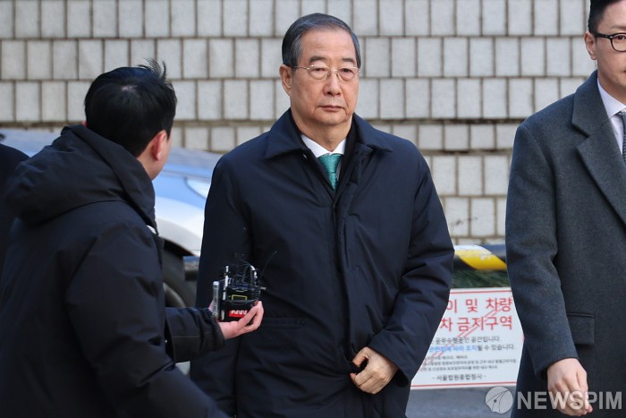 [서울=뉴스핌] 류기찬 기자 = 한덕수 전 국무총리가 21일 오후 서울 서초구 서울중앙지방법원에서 열린 내란 방조 및 내란 중요임무 종사 혐의 관련 1심 선고 공판에 출석하고 있다. 2026.01.21 ryuchan0925@newspim.com