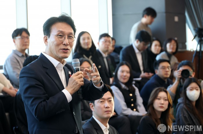 [서울=뉴스핌] 정일구 기자 = 김민석 국무총리가 21일 오후 서울 용산구 하이브 사옥에서 열린 청년 종사자 타운홀 미팅에서 인사말을 하고 있다. 2026.01.21 mironj19@newspim.com