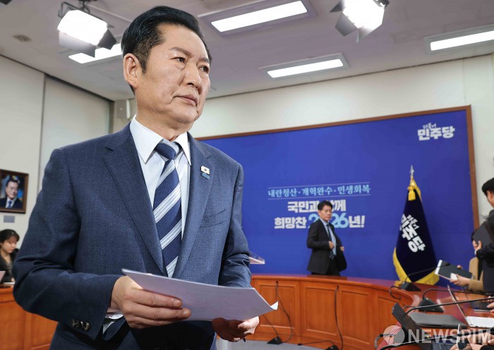 [서울=뉴스핌] 윤창빈 기자 = 정청래 더불어민주당 대표가 22일 서울 여의도 국회에서 긴급 기자회견을 마치고 나서고 있다. 정 대표는 기자회견을 통해 조국혁신당에게 합당을 제안했다. 2026.01.22 pangbin@newspim.com
