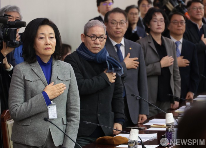 [서울=뉴스핌] 이길동 기자 = 박영선 전 중소벤처기업부 장관(왼쪽)등 회의 참석자들이 22일 서울 종로구 정부서울청사에서 열린 제340차 남북교류협력추진협의회 회의에서 국기에 경례하고 있다. 2026.01.22 gdlee@newspim.com