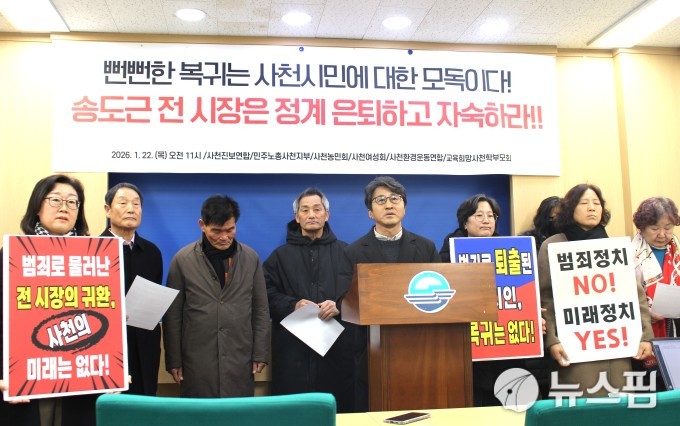사천진보연합을 비롯한 지역 시민 단체들은 22일 오전 사천시청 브리핑룸에서 기자 회견을 열고, "각종 논란과 도덕성 문제로 시민들에게 실망을 안겼던 인물이 다시 정치 전면에 나서는 것은 시민을 무시하는 행위"라며 "송 전 시장의 정치 복귀를 반대한다"고 밝혔다.