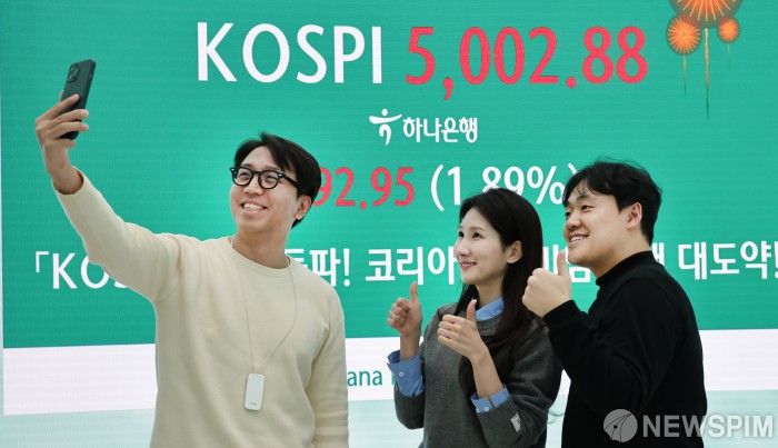 코스피 꿈의 5000선 돌파 기념하는 하나은행 직원들