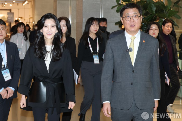 [서울=뉴스핌] 이형석 기자 = 최휘영 문화체육관광부 장관과 이부진 한국방문의해위원장이 22일 오후 서울 여의도 더현대 서울을 찾아 2026 코리아그랜드세일에 참여하는 매장 '위글위글'을 방문하고 있다. 2026.01.22 leehs@newspim.com