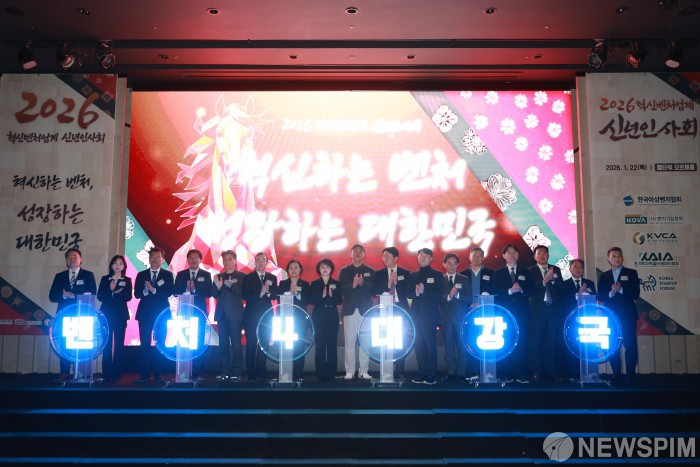 [서울=뉴스핌] 한성숙 중소벤처기업부 장관이 22일 서울 서초구 엘타워에서 열린 2026 혁신벤처업계 신년인사회에서 참석자들과 기념 퍼포먼스를 하고 있다.[사진= 중소벤처기업부] 2026.01.22 photo@newspim.com