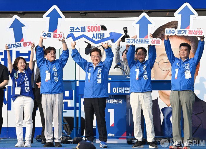 이재명 대통령이 더불어민주당 대선 후보 시절이었던 지난해 5월 서울 서초구 서울고속버스터미널 광장에서 코스피 상승 퍼포먼스를 선보이고 있는 모습. [사진=뉴스핌DB]지난해 6월 4일 코스피 지수는 71.87 포인트(2.66%) 상승하며 2770.84에 거래를 마감했다. [사진=뉴스핌DB]