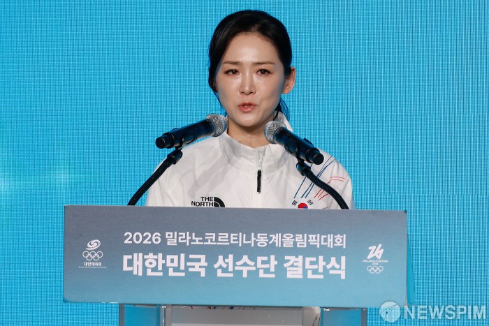 [서울=뉴스핌] 류기찬 기자 = 2026 밀라노 동계올림픽 선수단장인 이수경 대한빙상경기연맹 회장이 22일 오후 서울 송파구 올림픽파크텔에서 열린 ‘2026 밀라노 동계올림픽 선수단 결단식’에서 답사를 하고 있다. 2026.01.22 ryuchan0925@newspim.com