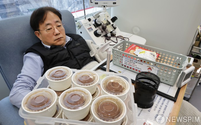[서울=뉴스핌] 양윤모 기자 = 23일 헌혈을 위해 서울동부혈액원 헌혈의집 광화문센터를 찾은 시민이 혈액 수급 위기 극복을 위해 두바이 쫀득 쿠키(두쫀쿠)를 ‘당일 제작’ 기념품으로 선착순 증정하는 이벤트행사에 참여하고 있다. 이번 행사는 23일부터 2월 26일까지 총 5회(매주 1회) 진행된다. 2026.01.23 yym58@newspim.com