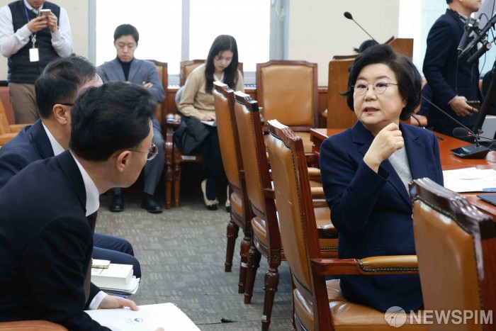 [서울=뉴스핌] 윤창빈 기자 = 이혜훈 기획예산처 장관 후보자가 23일 서울 여의도 국회에서 열린 재정경제기획위원회의 인사청문회에서 관계자와 대화하고 있다. 2026.01.23 pangbin@newspim.com