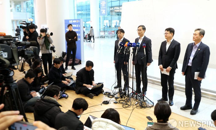 [영종도=뉴스핌] 정일구 기자 = '초국가범죄 특별대응 TF' 유승렬 치안감(왼쪽 두번째)이 23일 오전 인천국제공항 제2여객터미널 입국장에서 '로맨스 스캠 부부사기단' 등 캄보디아에서 각종 범행을 저지른 한국인 범죄 피의자 73명 송환 관련 브리핑을 하고 있다. 2026.01.23 mironj19@newspim.com