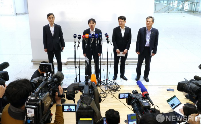 [영종도=뉴스핌] 정일구 기자 = '초국가범죄 특별대응 TF' 전성환 법무부 국제형사과 검사(왼쪽 두번째)가 23일 오전 인천국제공항 제2여객터미널 입국장에서 '로맨스 스캠 부부사기단' 등 캄보디아에서 각종 범행을 저지른 한국인 범죄 피의자 73명 송환 관련 브리핑을 하고 있다. 2026.01.23 mironj19@newspim.com