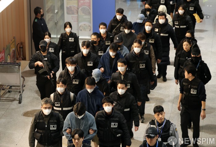 [영종도=뉴스핌] 정일구 기자 = 딥페이크 기술을 이용해 120억원을 가로챈 '로맨스 스캠 부부사기단' 등 캄보디아에서 각종 범행을 저지른 한국인 범죄 피의자 73명이 23일 오전 인천국제공항 제2여객터미널을 통해 송환되고 있다. 2026.01.23 mironj19@newspim.com