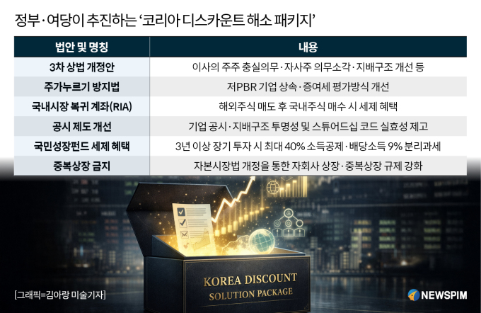 [서울=뉴스핌] 윤채영 기자 = 코스피 5000 달성이 현실화되면서 국내 증시 활성화를 위한 제도 개선 작업도 본격화되고 있다. 정부와 여당은 이른바 '코리아 디스카운트 해소 패키지'를 중심으로 자본시장 체질 개선에 속도를 낼 방침이다.
