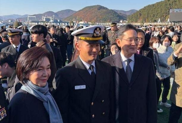 이재용 삼성전자 회장이 지난해 11월 28일 경남 창원 해군사관학교에서 열린 139기 해군 사관후보생 임관식에 참석해 장남 지호씨 소위 임관을 축하했다. 이 회장과 홍라희 삼성미술관 리움 명예관장이 지호씨와 함께 사진을 찍고 있다. [사진=공동취재단]