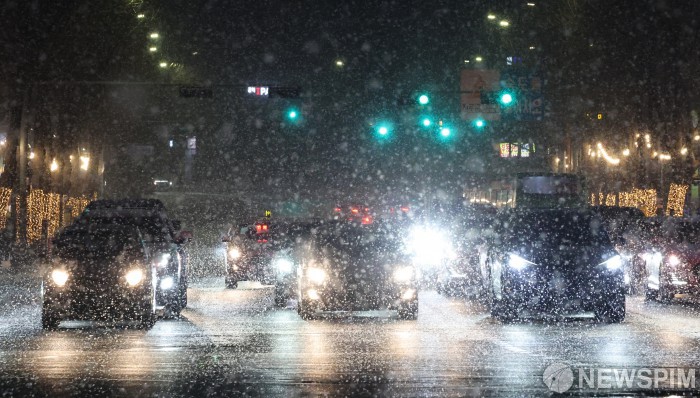 [서울=뉴스핌] 이형석 기자 = 23일 밤 서울 마포구 공덕역 인근에 많은 눈이 내리고 있다. 2026.01.23 leehs@newspim.com