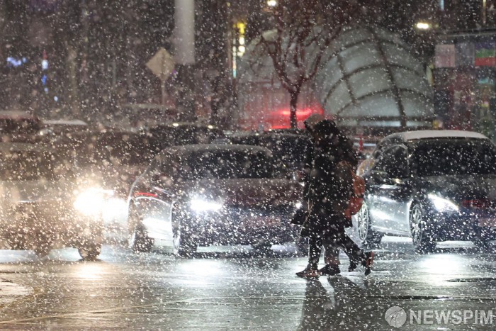 [서울=뉴스핌] 이형석 기자 = 23일 밤 서울 마포구 공덕역 인근에서 시민들이 내리는 눈을 맞으며 발걸음을 재촉하고 있다. 2026.01.23 leehs@newspim.com