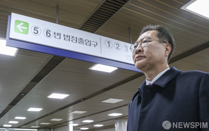 [서울=뉴스핌] 류기찬 기자 = 박성재 전 법무부 장관이 26일 오후 서울 서초구 서울중앙지방법원에서 열린 내란중요임무종사 혐의 사건 첫 공판기일에 출석하고 있다. 2026.01.26 ryuchan0925@newspim.com