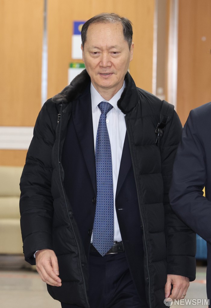 [서울=뉴스핌] 류기찬 기자 = 이완규 전 법제처장이 26일 오후 서울 서초구 서울중앙지방법원에서 열린 내란중요임무종사 혐의 사건 첫 공판기일에 출석하고 있다. 2026.01.26 ryuchan0925@newspim.com