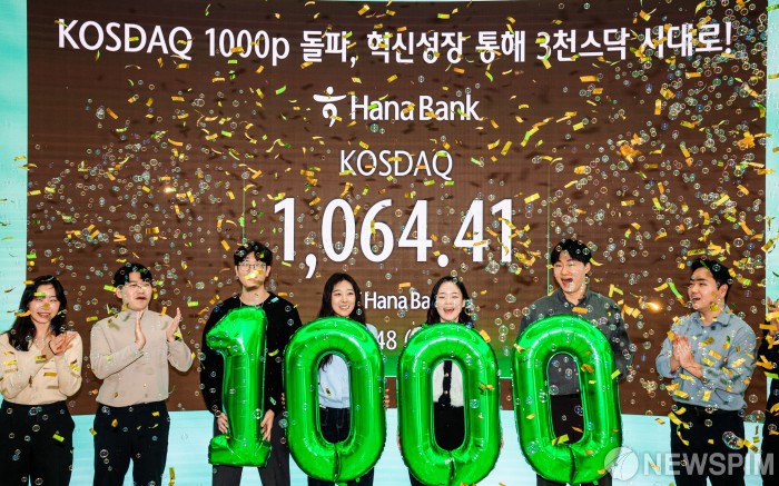 코스닥 1000 돌파 환영하는 하나은행 딜러들