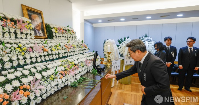 [서울=뉴스핌] 사진공동취재단 = 27일 서울 종로구 서울대학교병원 장례식장에 이해찬 민주평화통일자문회의 수석부의장의 빈소가 마련된 가운데 김동연 경기도지사가 조문을 하고 있다. 2026.01.27 photo@newspim.com