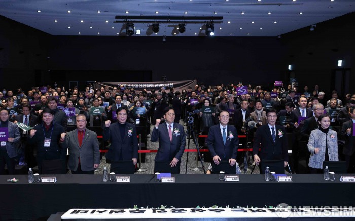 [서울=뉴스핌] 윤창빈 기자 = 송치영 소상공인연합회장, 이병권 중소벤처기업부 2차관, 송언석 국민의힘 원내대표 등 참석자들이 27일 서울 여의도 글래드호텔에서 열린 2026 소상공인연합회 신년인사회에서 기념촬영을 하고 있다. 2026.01.27 pangbin@newspim.com