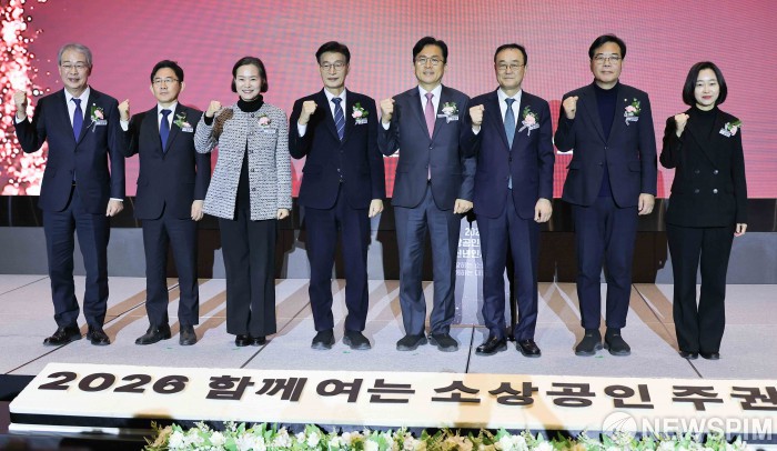 [서울=뉴스핌] 윤창빈 기자 = 송치영 소상공인연합회장, 이병권 중소벤처기업부 2차관, 송언석 국민의힘 원내대표 등 참석자들이 27일 서울 여의도 글래드호텔에서 열린 2026 소상공인연합회 신년인사회에서 기념촬영을 하고 있다. 2026.01.27 pangbin@newspim.com
