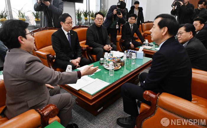 [서울=뉴스핌] 윤창빈 기자 = 국회 재정경제위원회 임이자 위원장이 27일 국회 본청 위원장실에서 구윤철 부총리 겸 재정경제부 장관, 박수영 재경위 야당 간사, 개혁신당 천하람 원내대표와 도널드 트럼프 미국 대통령의 관세 인상 언급과 관련해 면담하고 있다. 2026.01.27 pangbin@newspim.com