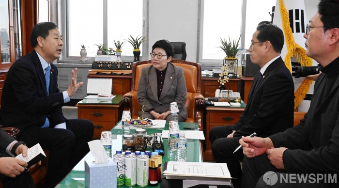 [서울=뉴스핌] 윤창빈 기자 = 국회 재정경제위원회 임이자 위원장이 27일 국회 본청 위원장실에서 구윤철 부총리 겸 재정경제부 장관, 박수영 재경위 야당 간사, 개혁신당 천하람 원내대표와 도널드 트럼프 미국 대통령의 관세 인상 언급과 관련해 면담하고 있다. 2026.01.27 pangbin@newspim.com