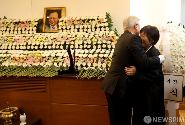 [서울=뉴스핌] 사진공동취재단 = 문재인 전 대통령과 김정숙 여사가 27일 오후 서울 종로구 서울대학교병원 장례식장에 마련된 고 이해찬 민주평화통일자문회의 수석부의장의 빈소를 찾아 유가족을 위로하고 있다. 2026.01.27 photo@newspim.com