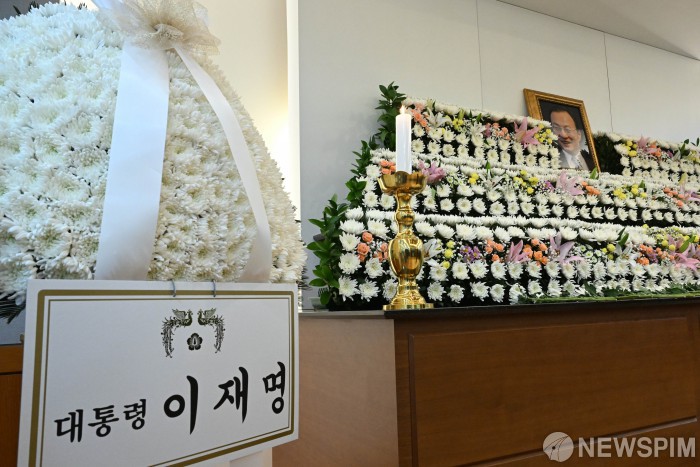 [서울=뉴스핌] 사진공동취재단 = 27일 서울 종로구 서울대학교병원 장례식장에 마련된 이해찬 민주평화통일자문회의 수석부의장의 빈소에 이재명 대통령 근조화환이 놓여 있다. 2026.01.27 photo@newspim.com