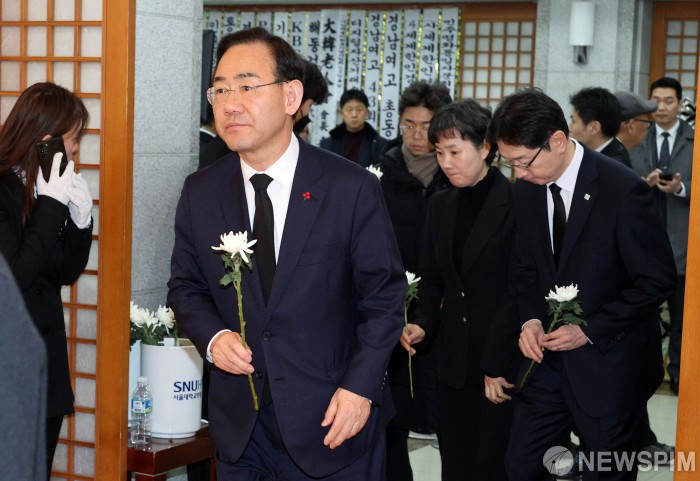 [서울=뉴스핌] 사진공동취재단 = 주호영 국회부의장이 27일 서울 종로구 서울대학교병원 장례식장에 마련된 고(故) 이해찬 전 국무총리의 빈소를 조문하고 있다. 2026.01.27 photo@newspim.com