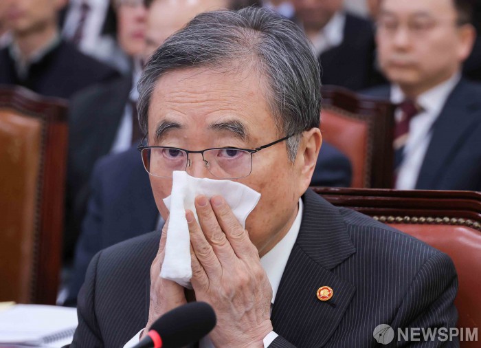 [서울=뉴스핌] 윤창빈 기자 = 조현 외교부 장관이 28일 서울 여의도 국회에서 열린 외교통일위원회 전체회의에서 손수건으로 입을 닦고 있다. 2026.01.28 pangbin@newspim.com