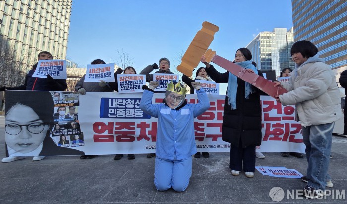 [서울=뉴스핌] 양윤모 기자 = 윤석열 전 대통령 부인 김건희 씨에 대한 1심 선고가 28일 오후 서울중앙지법 27 형사부(부장판사 우인성)에서 예정된 가운데, 전국민중행동 회원들이 서울 광화문광장 이순신 장군 동상 앞에서 '국정농단 김건희 엄중처벌 촉구' 퍼포먼스를 하고 있다. 2026.01.28 yym58@newspim.com