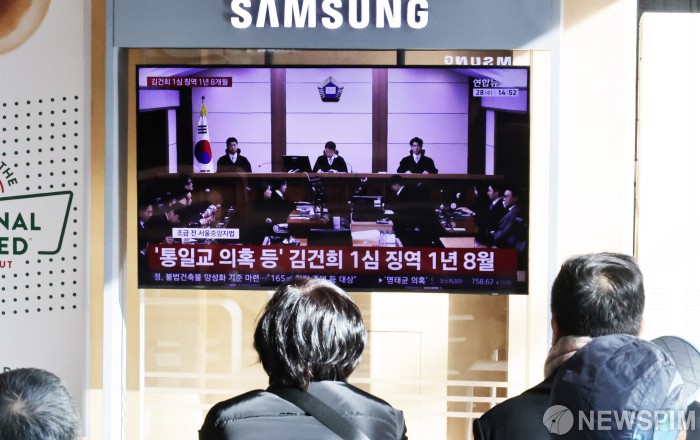 [서울=뉴스핌] 양윤모 기자 = 28일 오후 서울역 대합실을 찾은 시민들이 서울중앙지법 형사합의27부(부장판사 우인성)에서 진행되는 윤석열 전 대통령 부인 김건희 씨의 도이치모터스 주가조작과 명태균 공천개입, 통일교 청탁·뇌물 수수 의혹 혐의 등의 1심 선고 중계방송을 시청하고 있다. 재판부는 자본시장법 위반·알선수재·정치자금법 위반 등 혐의를 받는 김 씨에게 징역 1년 8월과 추징금 1281만원을 선고했다. 한편 재판부는 김 여사 혐의 중 도이치모터스 주가조작(자본시장법 위반), 명태균 여론조사(정치자금법 위반) 관련 혐의는 무죄로 판단했다. 2026.01.28 yym58@newspim.com