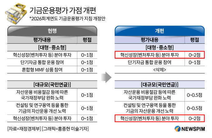 벤처투자에 대한 평가 인센티브도 강화된다. 혁신성장 분야 투자 가점은 기존 1점에서 2점으로 확대하고, 가점받을 수 있는 최소 투자 기준도 상향 조정했다. 대규모 기금은 3조원, 대형 기금은 1500억원 이상을 투자해야 가점받을 수 있다.