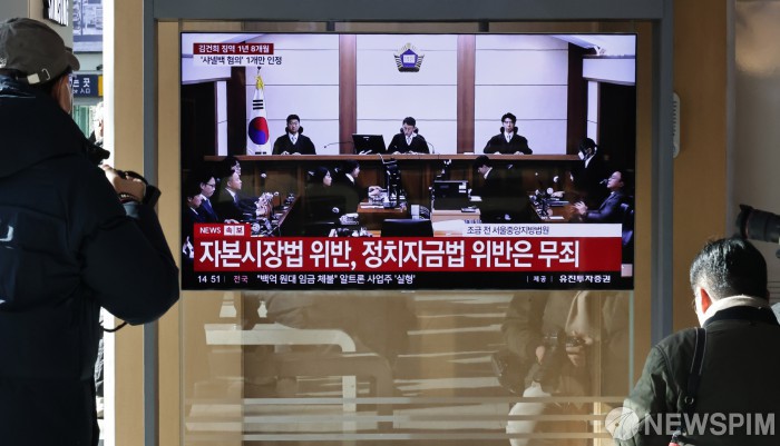 [서울=뉴스핌] 양윤모 기자 = 28일 오후 서울역 대합실을 찾은 시민들이 서울중앙지법 형사합의27부(부장판사 우인성)에서 진행되는 윤석열 전 대통령 부인 김건희 씨의 도이치모터스 주가조작과 명태균 공천개입, 통일교 청탁·뇌물 수수 의혹 혐의 등의 1심 선고 중계방송을 시청하고 있다. 재판부는 자본시장법 위반·알선수재·정치자금법 위반 등 혐의를 받는 김 씨에게 징역 1년 8월과 추징금 1281만원을 선고했다. 한편 재판부는 김 여사 혐의 중 도이치모터스 주가조작(자본시장법 위반), 명태균 여론조사(정치자금법 위반) 관련 혐의는 무죄로 판단했다. 2026.01.28 yym58@newspim.com
