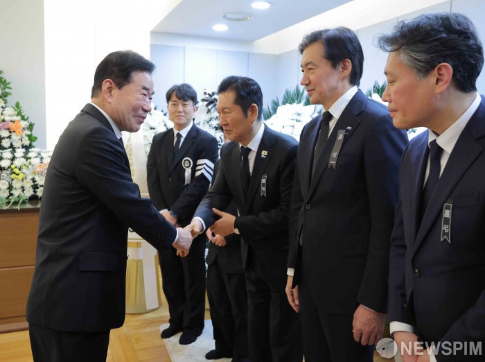 [서울=뉴스핌] 사진공동취재단 = 김진표 전 국회의장이 28일 서울 종로구 서울대학교병원 장례식장에 마련된 고 이해찬 전 국무총리의 빈소에서 조문을 하고 있다. 2026.01.28 photo@newspim.com