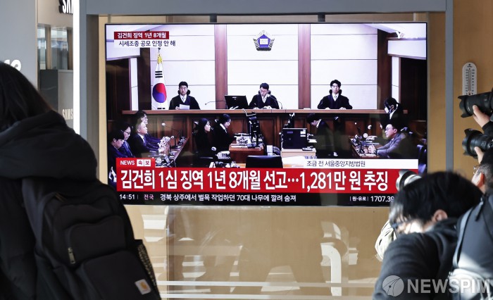 [서울=뉴스핌] 양윤모 기자 = 28일 오후 서울역 대합실을 찾은 시민들이 서울중앙지법 형사합의27부(부장판사 우인성)에서 진행되는 윤석열 전 대통령 부인 김건희 씨의 도이치모터스 주가조작과 명태균 공천개입, 통일교 청탁·뇌물 수수 의혹 혐의 등의 1심 선고 중계방송을 시청하고 있다. 재판부는 자본시장법 위반·알선수재·정치자금법 위반 등 혐의를 받는 김 씨에게 징역 1년 8월과 추징금 1281만원을 선고했다. 한편 재판부는 김 여사 혐의 중 도이치모터스 주가조작(자본시장법 위반), 명태균 여론조사(정치자금법 위반) 관련 혐의는 무죄로 판단했다. 2026.01.28 yym58@newspim.com
