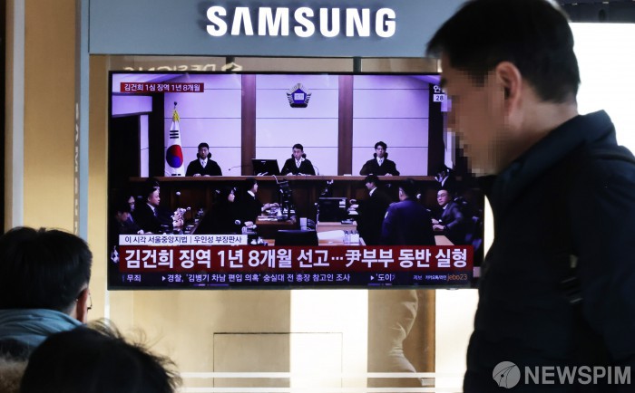 [서울=뉴스핌] 양윤모 기자 = 28일 오후 서울역 대합실을 찾은 시민들이 서울중앙지법 형사합의27부(부장판사 우인성)에서 진행되는 윤석열 전 대통령 부인 김건희 씨의 도이치모터스 주가조작과 명태균 공천개입, 통일교 청탁·뇌물 수수 의혹 혐의 등의 1심 선고 중계방송을 시청하고 있다. 재판부는 자본시장법 위반·알선수재·정치자금법 위반 등 혐의를 받는 김 씨에게 징역 1년 8개월과 추징금 1281만 원을 선고했다. 한편 재판부는 김 여사 혐의 중 도이치모터스 주가조작(자본시장법 위반), 명태균 여론조사(정치자금법 위반) 관련 혐의는 무죄로 판단했다. 2026.01.28 yym58@newspim.com