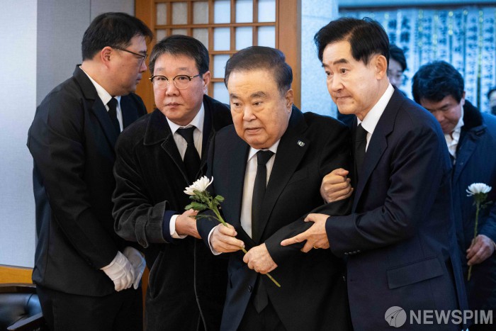 [서울=뉴스핌] 사진공동취재단 = 박병석 전 국회의장이 28일 오후 서울 종로구 서울대학교병원 장례식장에 마련된 故 이해찬 전 국무총리의 빈소에서 조문을 하고 있다. 2026.01.28 photo@newspim.com