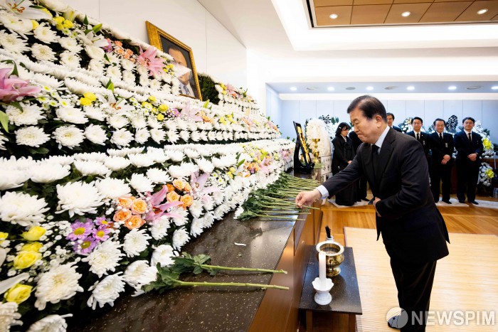 [서울=뉴스핌] 사진공동취재단 = 박병석 전 국회의장이 28일 오후 서울 종로구 서울대학교병원 장례식장에 마련된 故 이해찬 전 국무총리의 빈소에서 조문을 하고 있다. 2026.01.28 photo@newspim.com