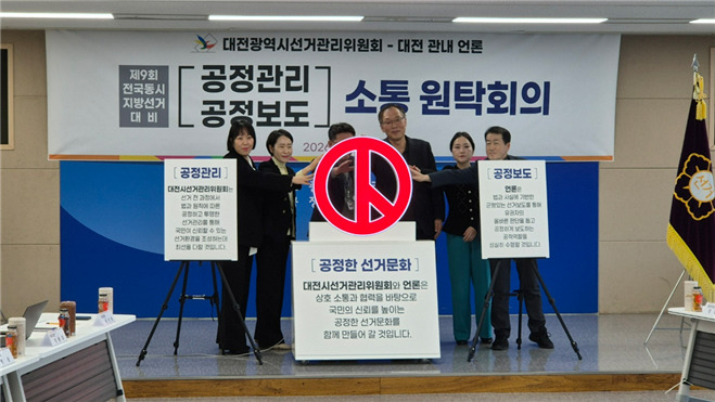 [대전=뉴스핌] 오종원 기자 = 대전선거관리위원회는 28일 오후 청사 내 대회의실에서 지역 언론과 '제9회 전국동시지방선거'를 대비해 공정관리·보도를 위한 소통 원탁회의를 개최했다. 이번 원탁회의에서는 오는 6월 3일 진행되는 지방선거를 앞두고 선관위와 언론이 상호 소통과 협력을 바탕으로 공정한 선거문화 조성에 대한 인식을 같이하고 지방선거 주요 선거사무및 공직선거법상 언론 보도와 관련된 핵심 사항을 중심으로 논의가 진행됐다. 사진은 공동 메시지 퍼포먼스 후 기념촬영을 하고 있는 선관위 및 언론 관계자 모습. [사진=대전선거관리위원회] jongwon3454@newspim.com